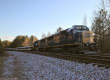 CSXT SD50-2's 2489 (CSX 8658/CR 6738) and 2498 (CSX 8675/CR 6771) wait for clearance with a line of ballast cars in Tyrone, GA on February 18, 2015.