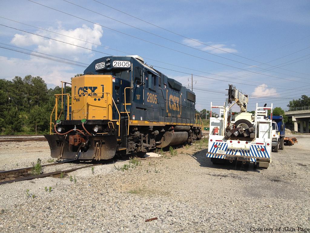 Here at Fairburn on Sunday, May 25, 2805 idles beside CSX International crane 487002 and a Chevy C7500 dump truck 450081 and trailer.