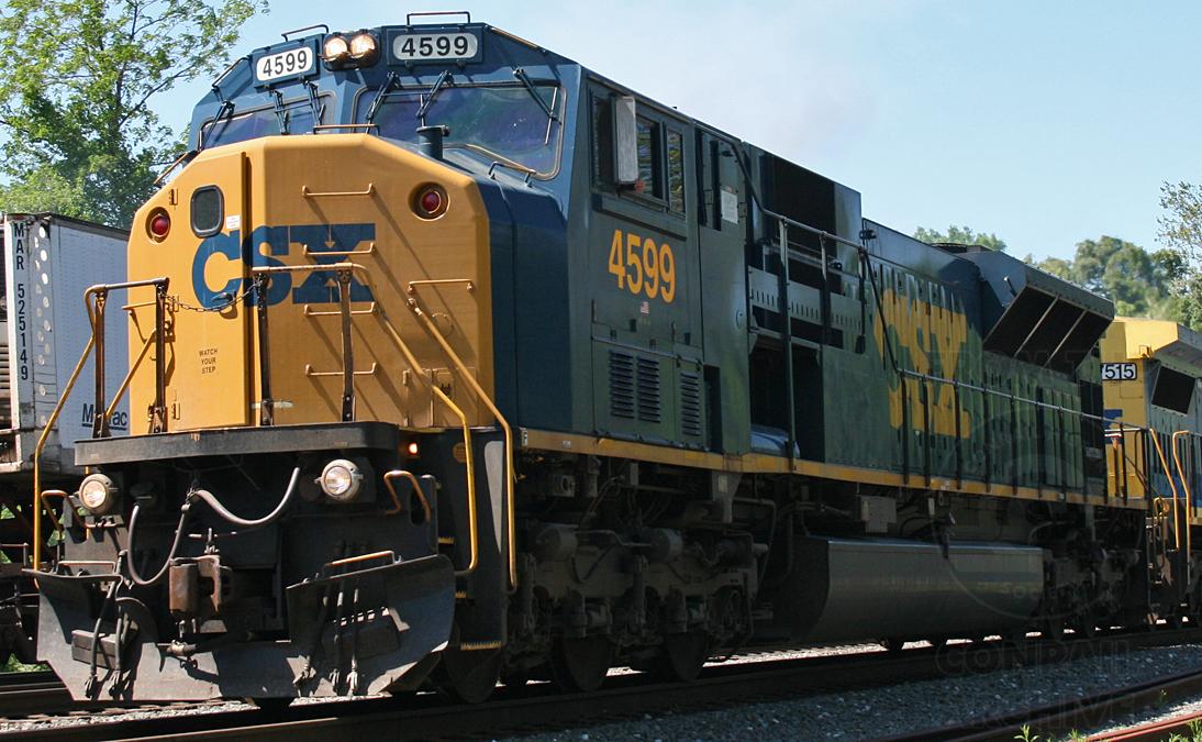 CSX SD80MAC 4599 is seen leading CSX general merchandise train Q-411 past the MARC commuter station at St. Denis, MD.