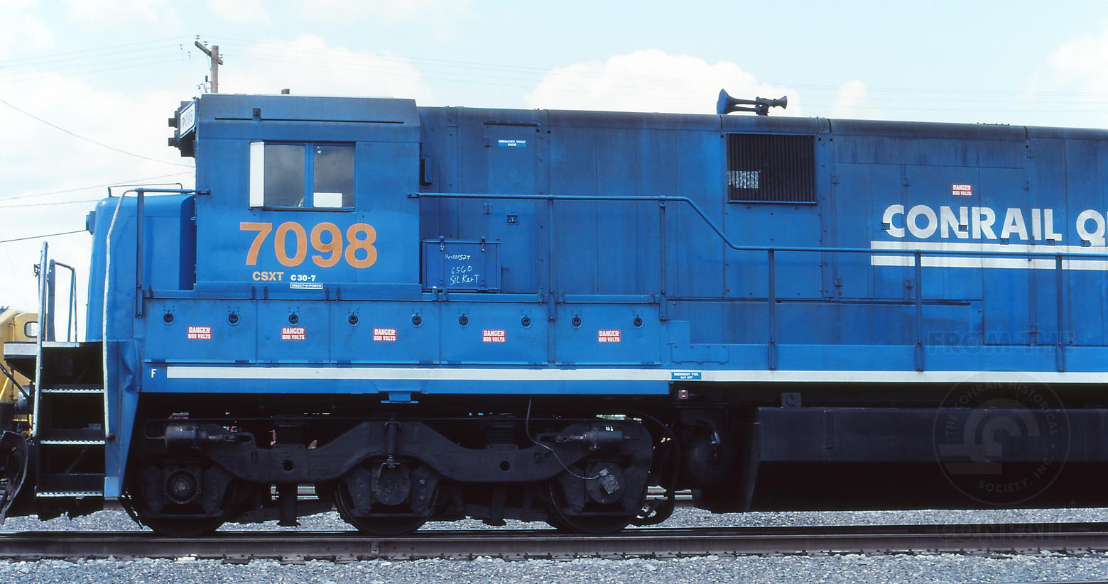 Previous Next Detail view of former CR C30-7A 6560 at Cumberland, MD on 6/18/99. Photo By Jeff Weaver Equipment Type GE C30-7A Conrail Number 6560 Post Conrail Owner CSX Post Conrail Number CSX 7098 Year 1999 Original Date 6/18/99 Collection CRHS Conrail Photo Archive Contributions