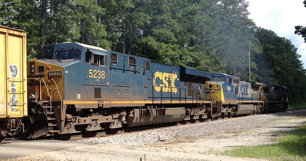 CSX C40-8W's 7706 and 7368 (CR 6217), and ES40DC 5238 head southbound past N.E. Aberdeen signal in Tyrone, GA on August 3, 2014.