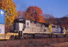 Former CR C32-8 6612, now CSX 7477, brings up the trail position in Q166 at Huntington, MA. on Oct.16, 1999. I was happy to get this shot of the 6612 as it had always been one of my "fave" engines on the B&A, and this was the last time I saw it.