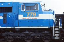 Previous Next Detail view of former CR 4134 at Keyser, WV on 7/10/99. Photo By Jeff Weaver Equipment Type EMD SD70MAC Conrail Number 4134 Post Conrail Owner CSX Post Conrail Number CSX 779 Year 1999 Original Date 7/10/99 Collection CRHS Conrail Photo Archive Contributions