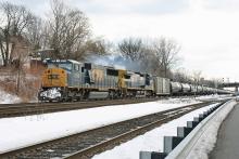 CSX 8744 (ex-CR 5631) is on the point of K-409 at CP-5 in Ridgefield Park, NJ 2/12/2011. Note that the marker lights are still intact on this locomotive.