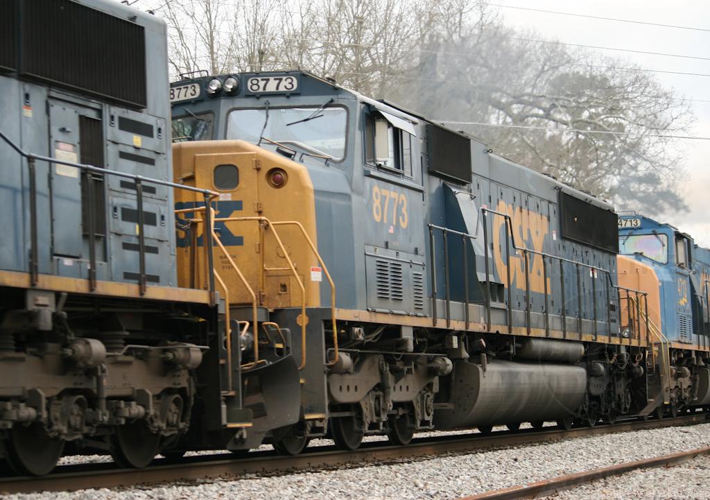 CSX SD70AC 4509 leads SD60M 8773 (CR 5543), and SD70MAC 4713 across Flat Shoals Rd in Union City, GA on February 24, 2016.