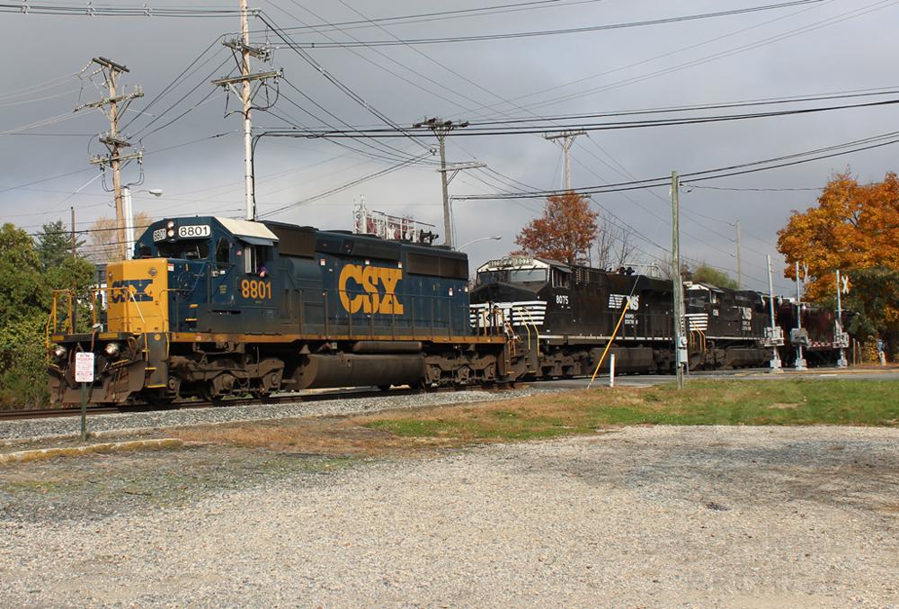 CSXT 8801 (CR 6370), NS 8075 & NS 1088 are seen on CSX K055-12 at Newark, DE on 11/11/14.