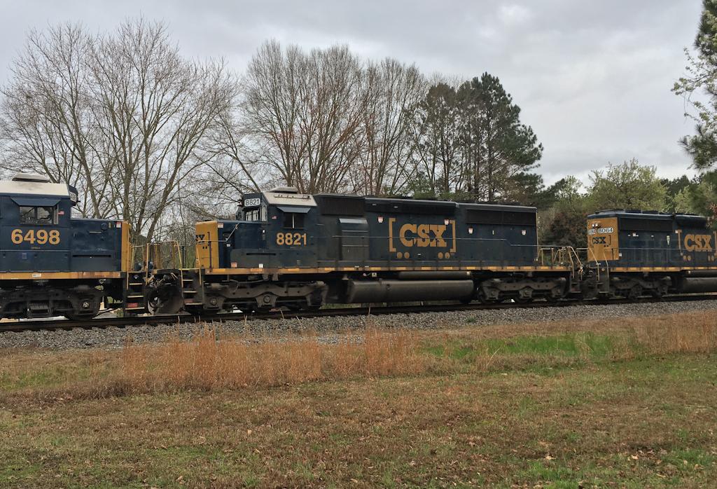 CSX SD40-2 8821 (CR 6411) runs second in a quartet of units crossing Elgin Road in Fairburn on February 28, 2019.
