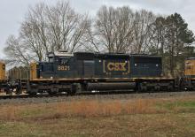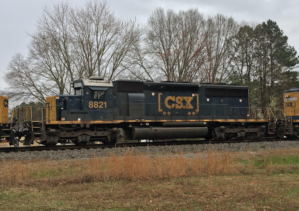 CSX SD40-2 8821 (CR 6411) runs second in a quartet of units crossing Elgin Road in Fairburn on February 28, 2019.
