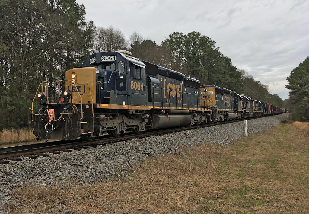 CSX SD40-2s 8064 and 8821 (CR 6411), and GP40-2 6498 and mate 2319, haul a line of boxcars at the south end of Fairburn yard on February 28, 2019.