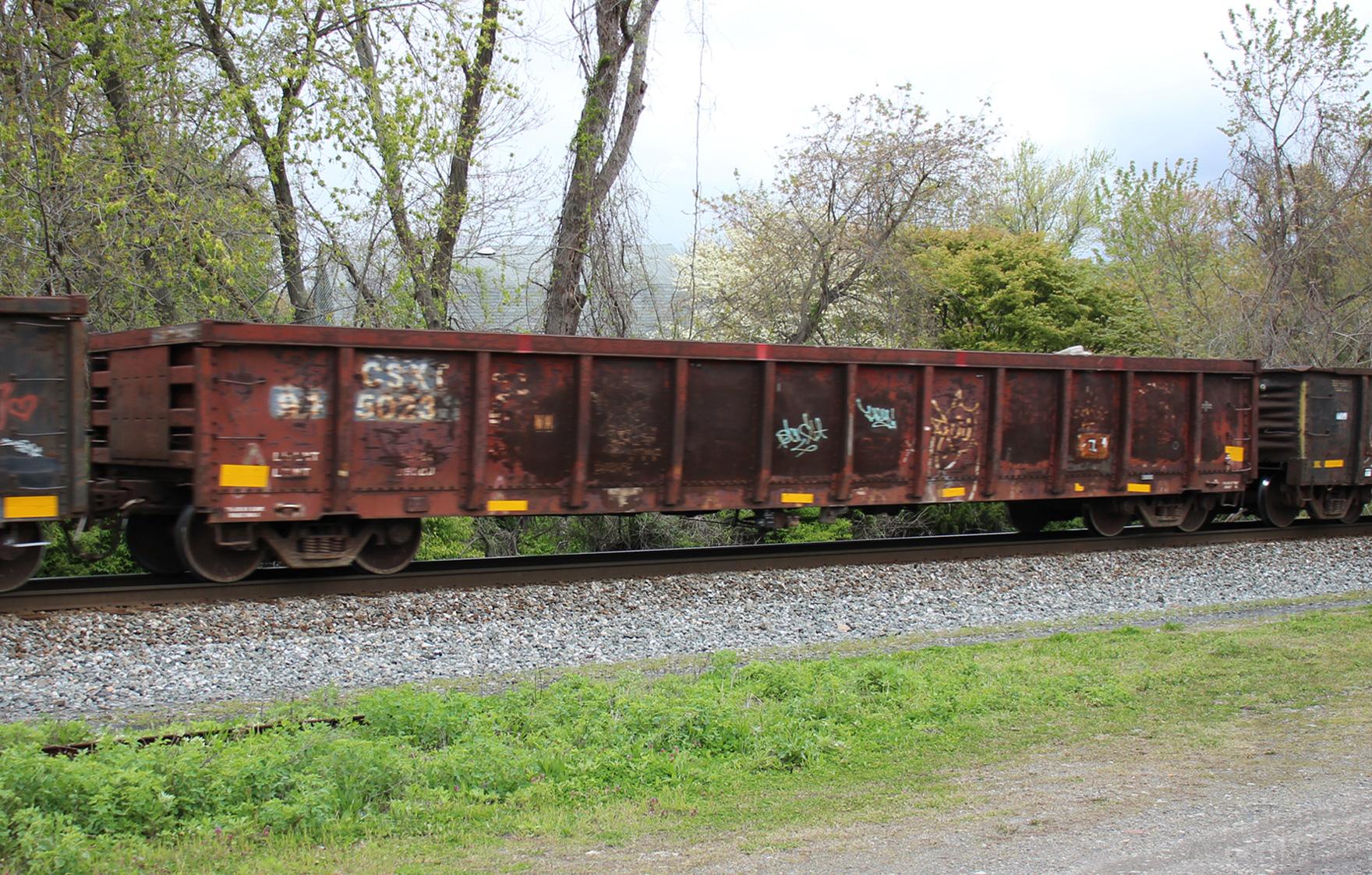 CSXT 915023 is seen in the consist of CSX Q410-25 at Chichester, PA on 4/27/20. Car is ex NYC 588432/CR 588432/CR 576507/PRR 387530 and was built 10-66 as a PRR G43 class gon. Photo by Chris Carangi.