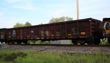 CSXT 915515is seen in the consist of CSXM372-11 at Perryville, MD on 8/12/23. Car is ex NYC 587933/CR 587933/CR 580574/PC 580574 and was built 12-71 as a PC G47 class gon.