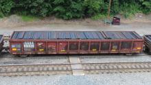 CSXT 915539 is seen in the consist of CSX Q398-14 at Cumberland, MD on 6/14/17. Car is ex NYC 588555/CR 588555/CR 579108/PC 579108 and was built as a PC G43 class gon in 3-70.