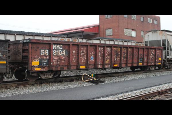 CSXT 915864 is seen at Elsmere, DE on 11/18/23. Car is exNYC 588244/CR 588244/CR 580515/PC 580515 and was built 12-71 as a PC G47 class gon.