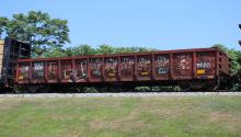 CSXT 915932 is seen in the consist of CSX Q410-15 at Newark, DE on7/17/21. Car is ex NYC 588598/CR 588598/CR 579602/PC 579602 and was built 3-70 as a PC G43C class gon.