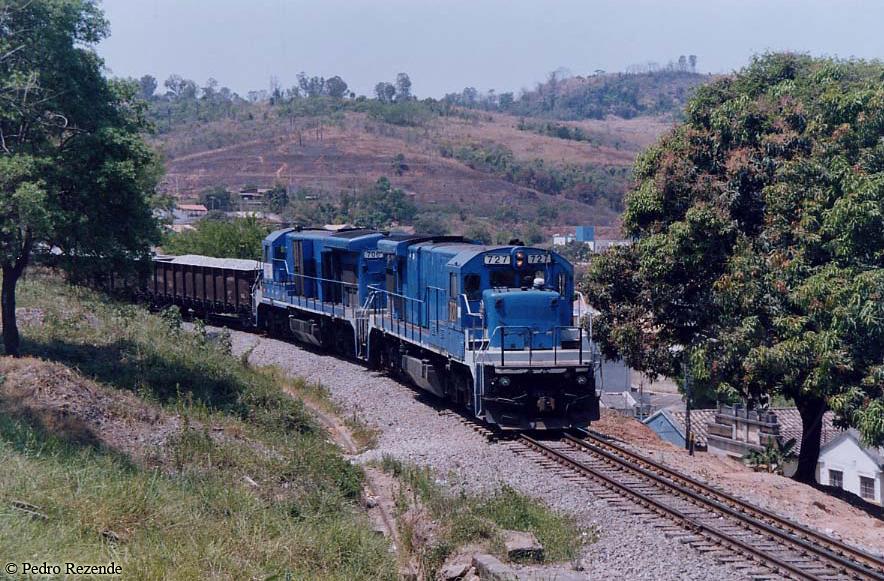 Former Conrail B36-7 5007 (currently EFVM BB36-7 727) and Conrail 5020 (now EFVM 706) leading a limestone train at Pedro Leopoldo, MG Brazil on September 25, 2004.
