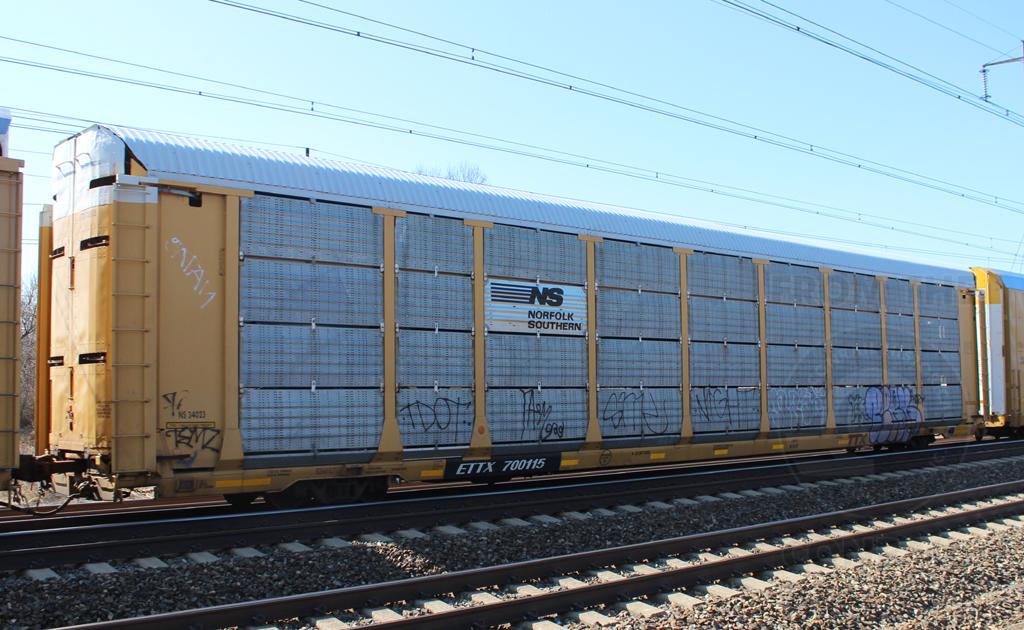 ETTX 700115 is seen in the consist of NS 28W at Newark, DE on 3/23/15. Rack was built as CR 6153, a CR ML3K class rack, in 6-88 and then rebuilt, repainted and renumbered to NS 34023 in 7-11. Rack is now classed FT639 by NS.
