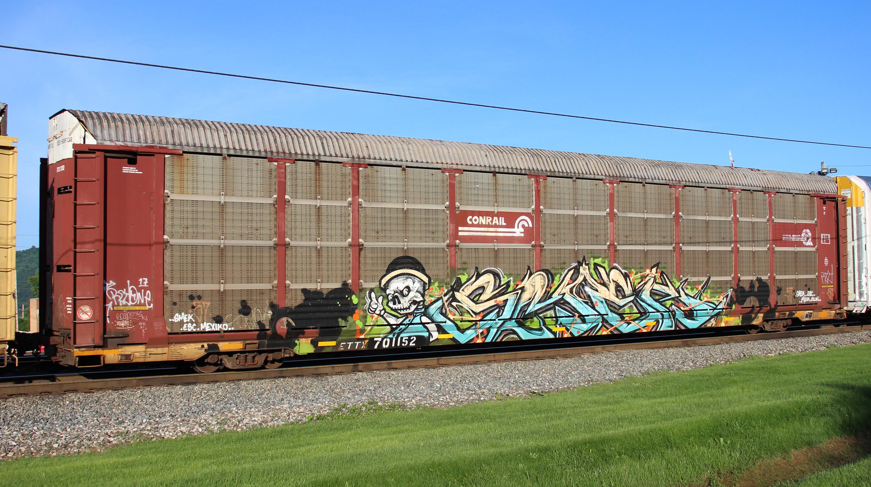 ETTX 701152 is seen in the consist of CSX Q216-12 at Cumberland, MD on 6/14/18. Rack number is CR 7420, built 5-89, rebuilt 8-97 and is now owned by NS.