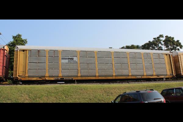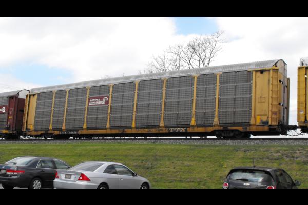 ETTX 701161 is seen in the consist of CSX M356-27 at Hoytville, OH on 6/27/25. Rack number is CR 7323, built 4-89, rebuilt 9-97, and is now owned by NS.