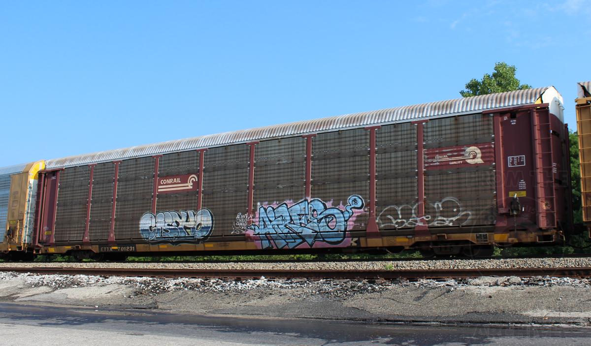 ETTX 701231 is seen in the consist of CSX Q217-11 at Elsmere, DE on 7/11/14. Rack number is CR 7156, built 3-89, rebuilt 4-97 and is now owned by CSX.
