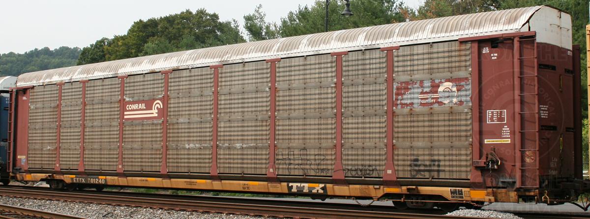 Previous Next Flatcar ETTX 701240 is seen with CR class ML3N rack #7148. Rack was built 3-89 and was rebuilt 5-97. Photo By Donnie Lee Equipment Type ETTX Tri-Levels Year 2011 Original Date 9/3/11 Collection CRHS Conrail Photo Archive Contributions