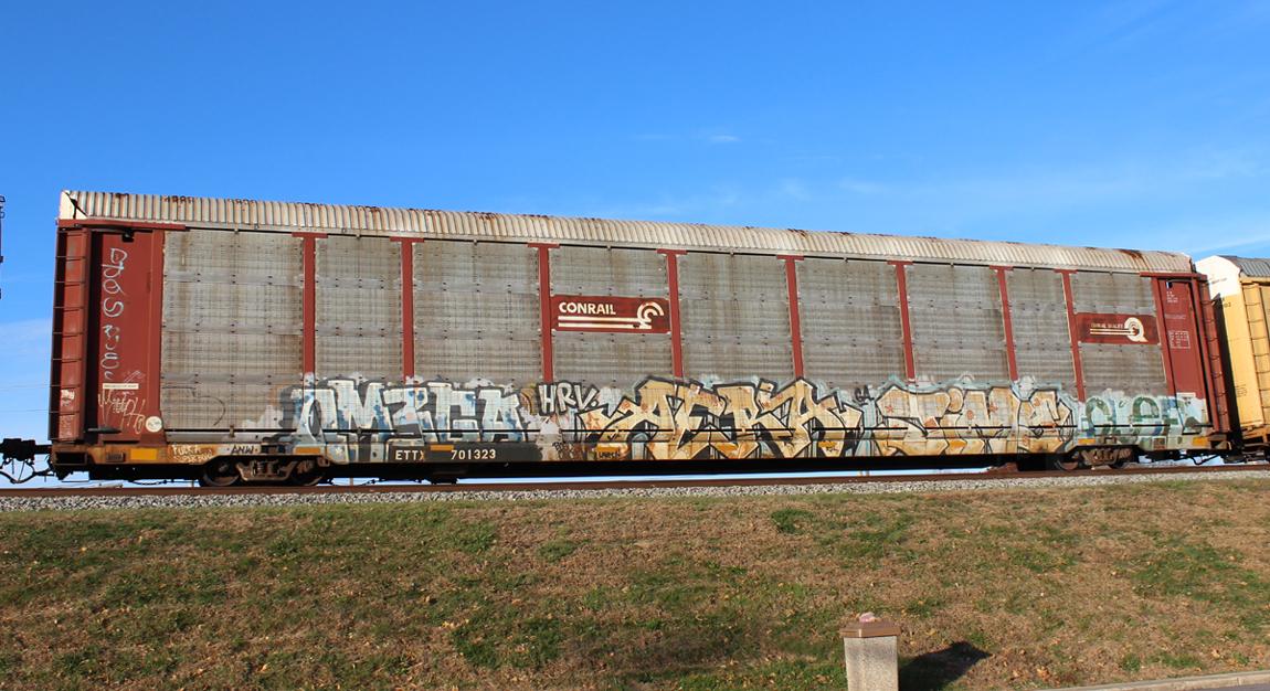 ETTX 701323 is seen in the consist of CSX Q296-20 at Newark, DE on 11/23/16. Rack number is CR 7284, built 4-89, rebuilt 3-97 and is now owned by NS.