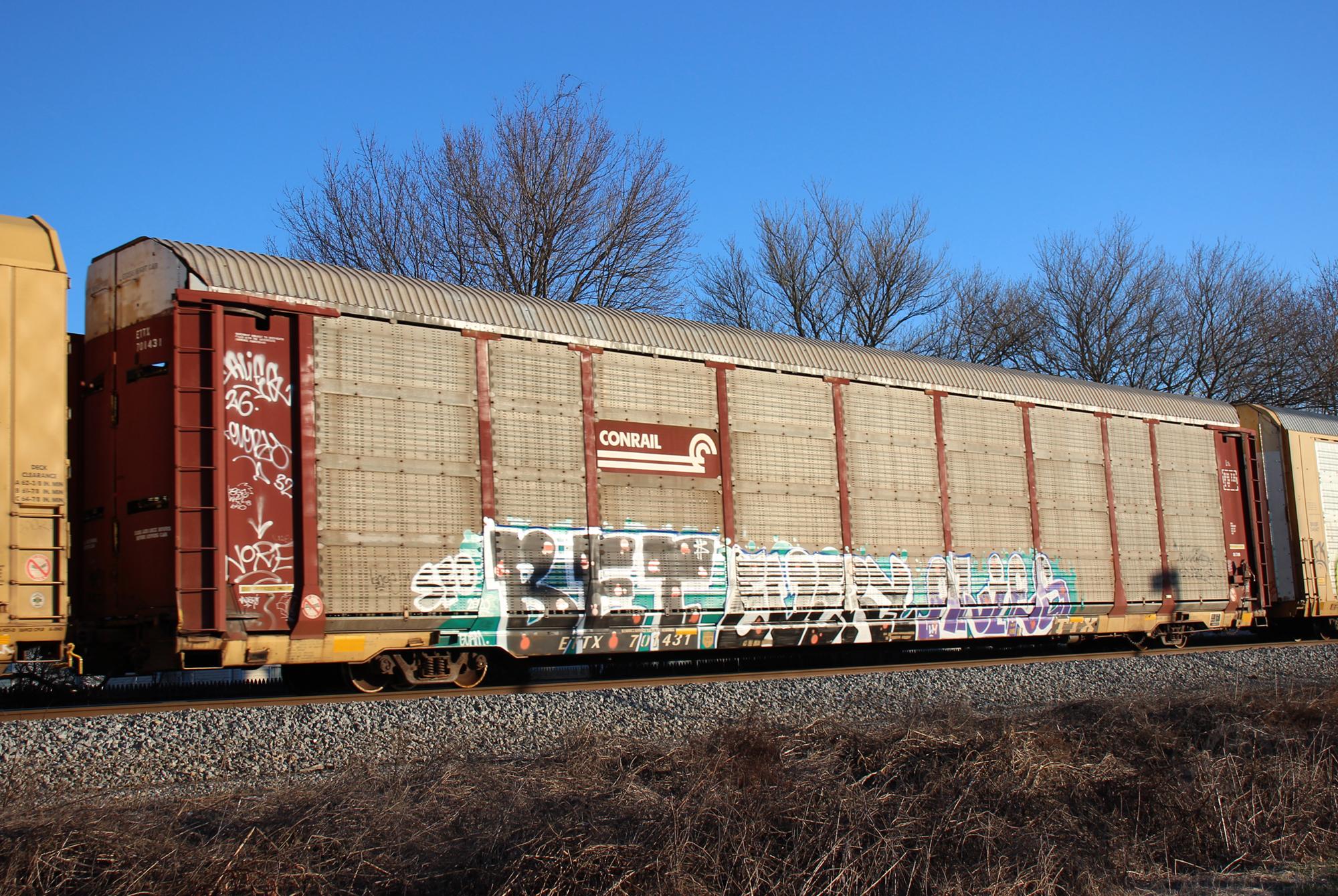 ETTX 701431 is seen in the consist of CSX Q217-27 at Newark, DE on 12/27/20. Rack number is CR 7391, built 4-89 (stenciled 1-89), rebuilt 5-97 and is now owned by NS.