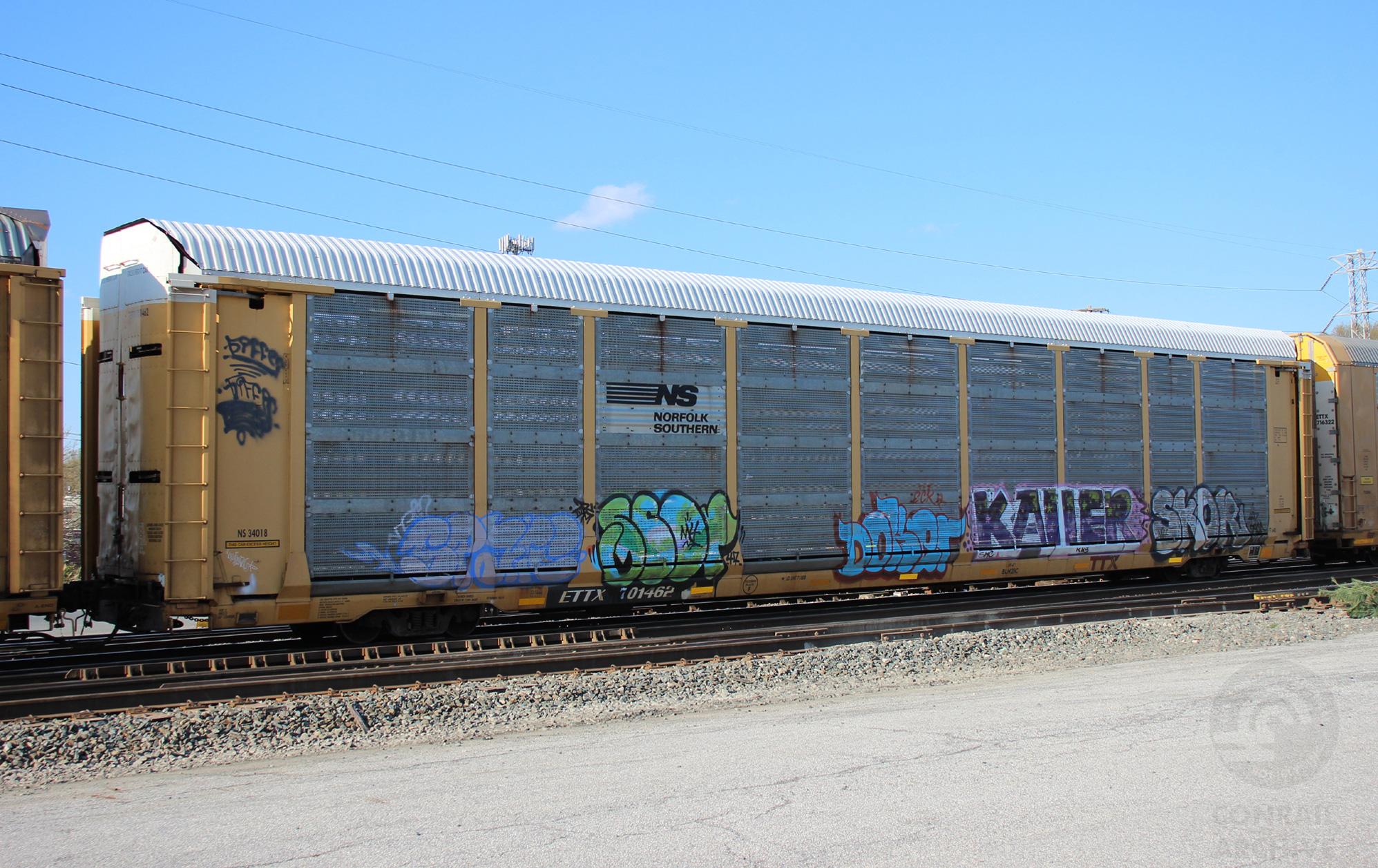 ETTX 701462 is seen in the consist of CSX Q371-11 at Elsmere, DE on 4/11/20. Rack was built as CR 7397, a CR ML3N class rack, in 5-89. It was then rebuilt, repainted and renumbered to NS 34018 in 8-11. Rack is now classed FT640 by NS. Photo by Chris Carangi.