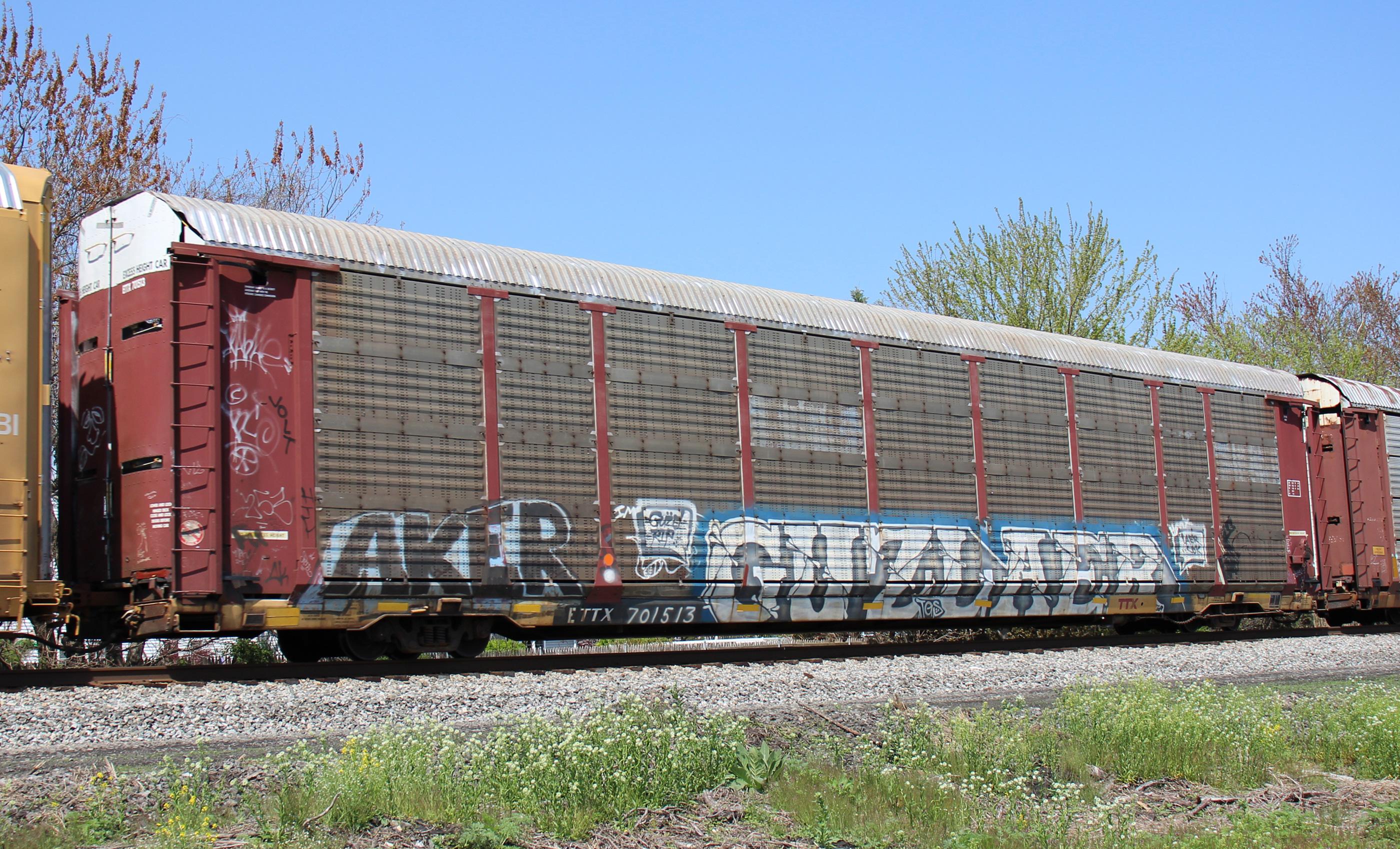 ETTX 701513 is seen in the consist of CSX Q216-26 at Newark, DE on 4/28/18. Rack number is CR 7463, built 5-89, rebuilt 4-97, and is now owned by CSX.
