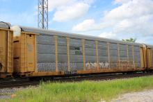 ETTX 710004is seen in the consist of CSX M217-06at Elsmere, DE on 8/6/22.Rack was built as an unknown CR ML3T class standard height rack in 3-95. Then rebuilt by CR to 20'2" rack and classed ML3W in 1998. The rack was then rebuilt back to a standard height rack in 5-08 and numbered to NS 33600 and classed FT645. Note the weld line near the top of the rack where the roof was welded back to the rack.