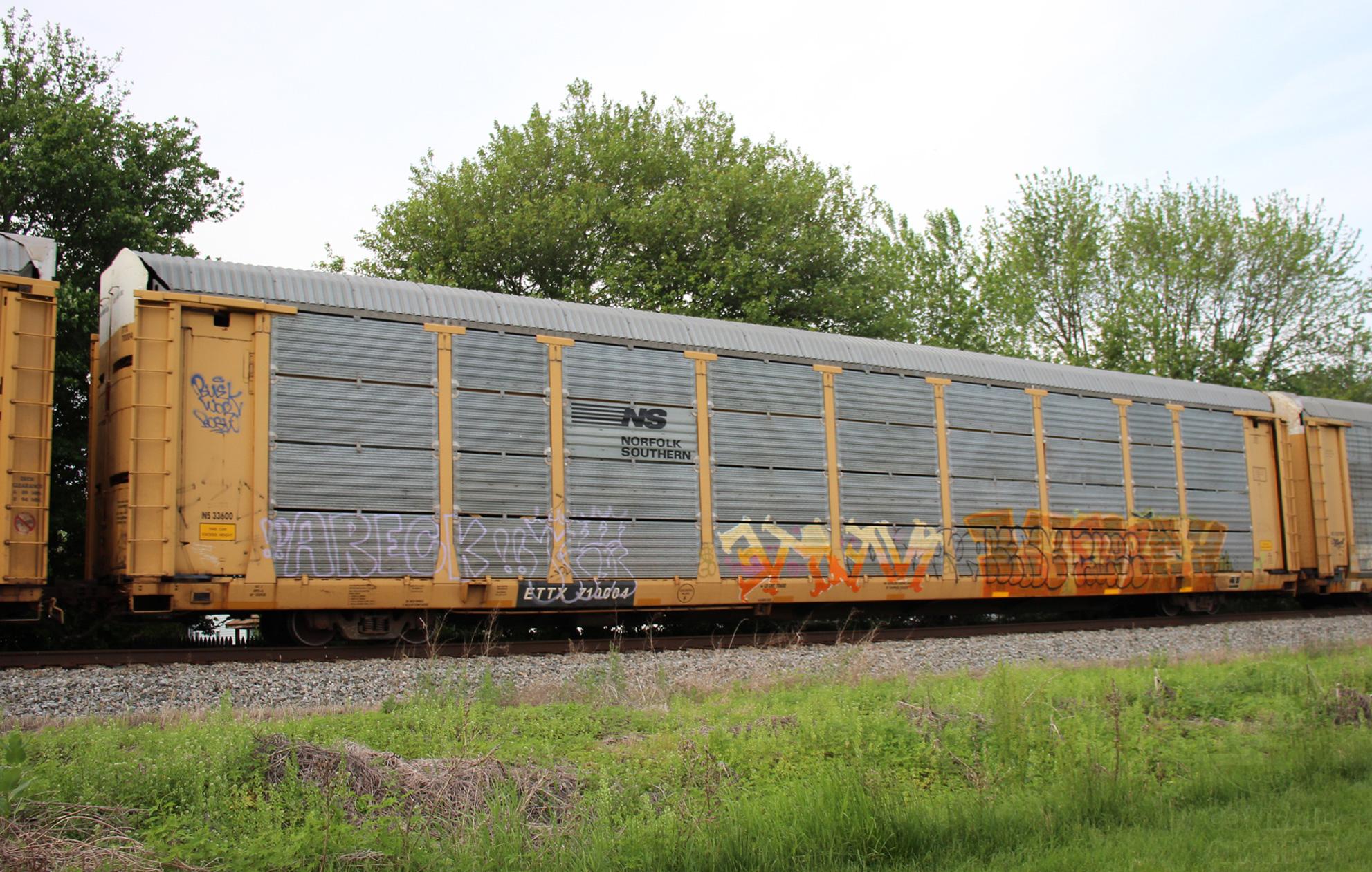 ETTX 710004 is seen in the consist of CSX Q216-18 at Newark, DE on 5/19/19. Rack was built as a unknown CR ML3T class standard height rack in 3-95. Then rebuilt by CR to 20'2" rack and classed ML3W in 1998. The rack was then rebuilt back to a standard height rack in 5-08 and numbered to NS 33600 and classed FT645. Note the weld line near the top of the rack were the roof was welded back to the rack.