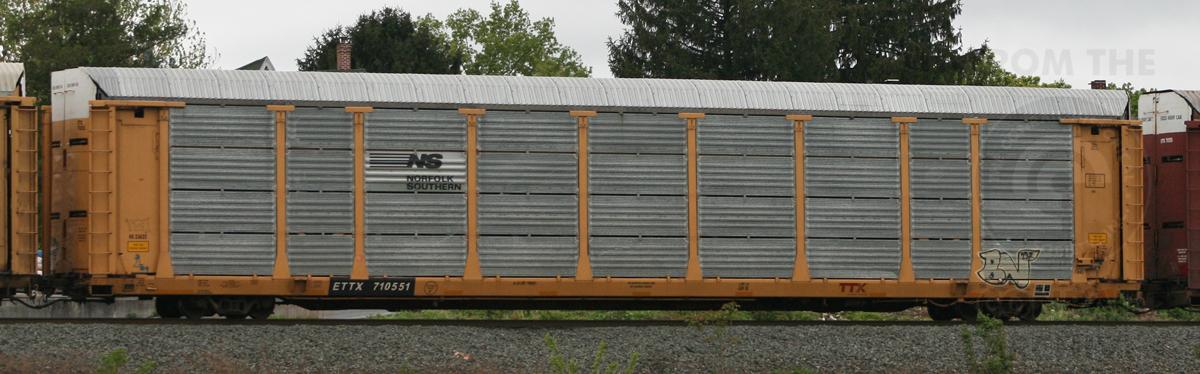 Previous Next Photo By Donnie Lee ETTX 710551 is ex TTQX 710551 - with NS Rack # 33625 (former CR) built 4-95, rebuilt 5-08. This was once a TTQX 20'2" autorack that was cut down to a regular tri-level and relettered to ETTX. Equipment Type ETTX Tri-Levels Year 2012 Original Date 4/22/12 Collection CRHS Conrail Photo Archive Contributions