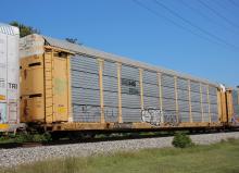 ETTX 710605 is seen in the consist of CSX M217-14 at Stanton, DE on 9/14/24. Rack was built as an unknown CR ML3T class standard height rack in 4-95. Then rebuilt by CR to 20'2" rack and classed ML3W in 1998. The rack was then rebuilt back to a standard height rack in 8-08 and renumbered to NS 33637. Note the weld line near the top of the rack where the roof was welded back to the rack.