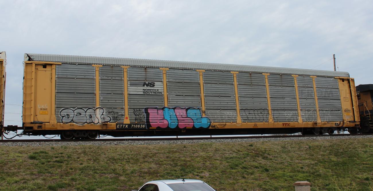 ETTX 710636 is seen on Q296-22 at Newark, DE on 4/7/15. Rack was built as CR 10407, a CR ML3T class standard height rack in 3-95. Then rebuilt by CR to 20'2" rack and classed ML3W in 1998. The rack was then rebuilt back to a standard height rack in 6-08 and renumbered to NS 33652. Note the weld line near the top of the rack were the roof was welded back to the rack.
