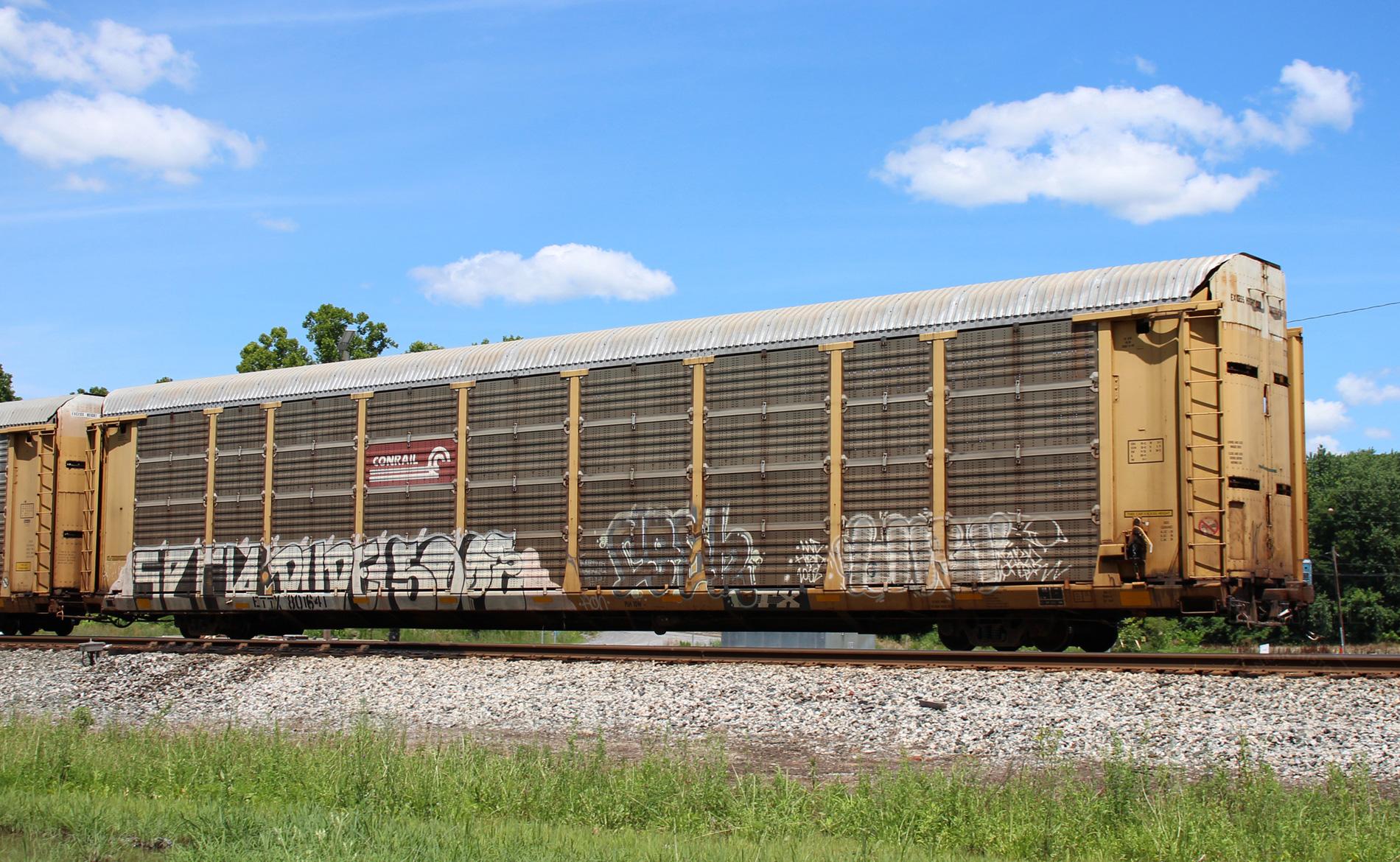 ETTX 801641 is seen in the consist of CSX Q217-22 at Hancock, WV on 6/22/19. Rack number is CR 8581, built 12-89, rebuilt 8-98 and is now owned by NS.