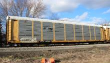 ETTX 803199 is seen in the consist of CSX Q216-14 at Newark, DE on 3/16/18. Rack was built as a unknown CR ML3K class rack in 8-88, then was rebuilt, repainted and renumbered to NS 34043 in 9-12. Rack is now classed FT639 by NS.