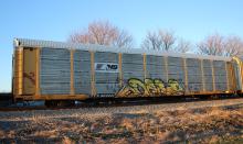 ETTX 803221 is seen in the consist of CSX X217-04 at Newark, DE on 3/4/18. Rack was built as CR 6861, a CR ML3N class rack, in 1-89 then was rebuilt, repainted and renumbered to NS 33967 in 6-13. Rack is now classed FT640 by NS.