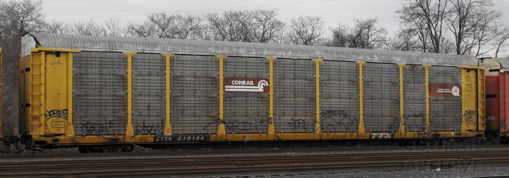 ETTX 810194 is seeen on H6Q at Edgemoor DE on 1/2/11. Rack number is CR 8671 built 12-89 & rebuilt 12-97. The 12-97 rebuilt date is the earliest date I've seen of a CR rack being repainted yellow.