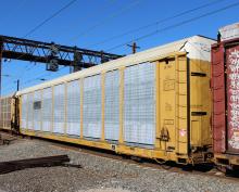 ETTX 850107 is seen in the consist of NS 36A at Newark, DE on 10/12/14. Rack number is CR 7164, built 3-89, rebuilt and repainted CSX in 8-13. Note the rack has the new CSX HTM logo.
