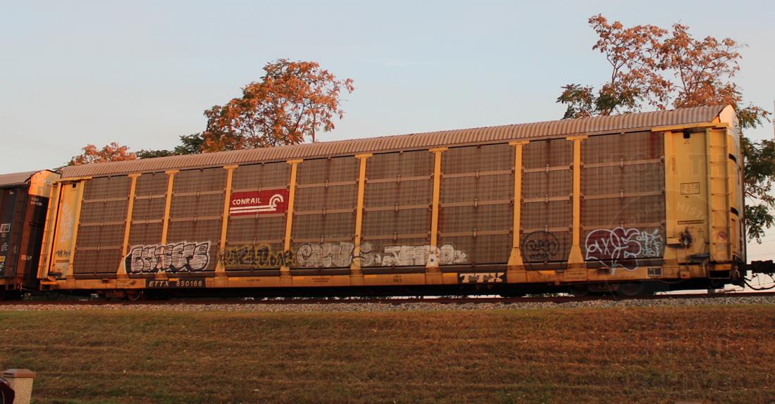 ETTX 850166 is seen in the consist of CSX Q217-17 at Newark, DE on 10/20/15. Rack number is CR 7123, built 3-89, rebuilt 4-98 and is now owned by NS.
