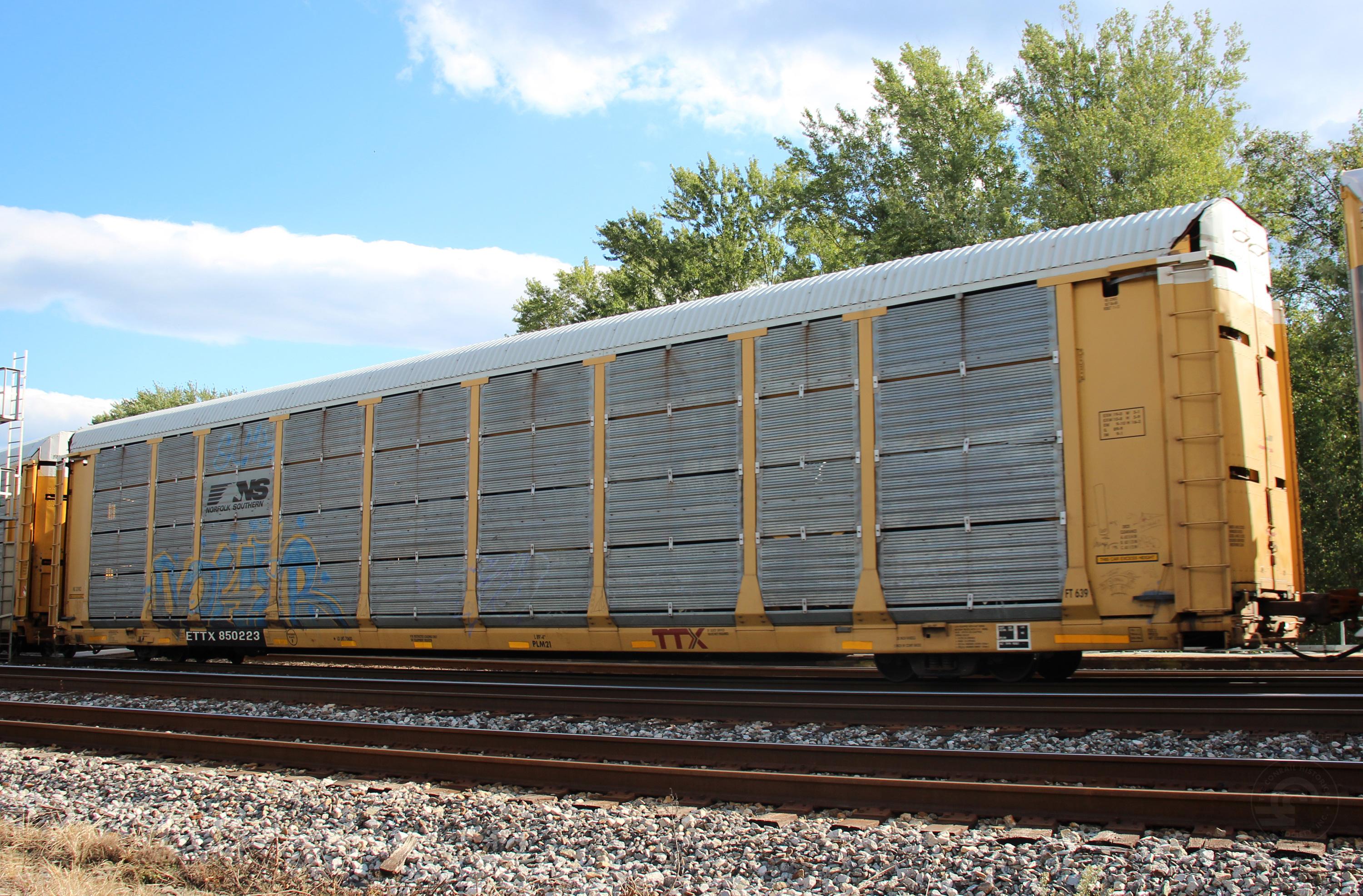 ETTX 850223 is seen in the consist of CSX Q216-18 at Point of Rocks, MD on 10/20/18. Rack was built as a unknown CR ML3K class rack in 6-88, then was rebuilt, repainted and renumbered to NS 33982 in 11-12. Rack is now classed FT639 by NS.