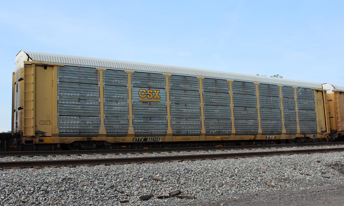 ETTX 852749 is seen in the consist of CSX Q261-12 at Green Spring, WV on 6/13/15. Rack number is CR 8928, built 4-90 then rebuilt and repainted CSX in 3-07.