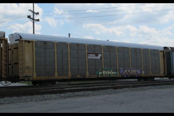 ETTX 852985 is seen in the consist of CSXQ216-28 at Newark DE on 8/30/11. Rack was built as anunknown CR ML3R class rack in 3-90. It was then rebuilt, repainted and renumbered toNS 33842 in 7-08. Rack does not have a new NS rack class stenciled on it. Note the odd style of ETTX reporting marks used on the flat.