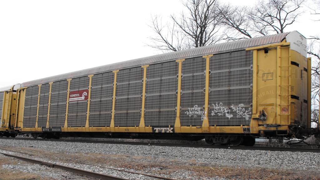ETTX 860359 is seen in CSX Q216-09 at Newark, DE on 3/11/14. Rack number is CR 8700, built 2-90, rebuilt and repainted yellow 1-99 and is now owned by CSX.
