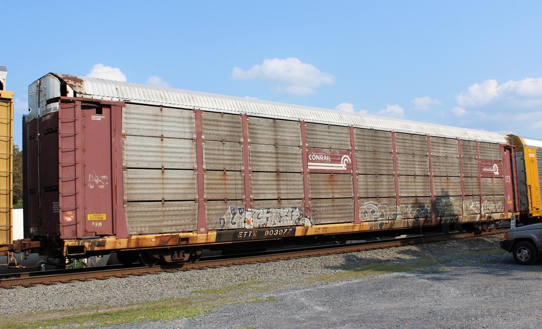 ETTX 903977 is seen in the consist of NS 27N at Marysville, PA on 8/9/14. Rack number is CR 3826, built 10-87 and is now owned by CSX.