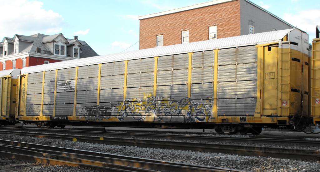 ETTX 905178 is seen in CSX Q249-29 at Cumberland MD. Rack was built as a unknown CR ML3L class rack in 4-88 and rebuilt, repainted and renumbered to NS 33514 in 4-08.
