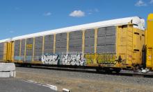 ETTX 905587 is seen in CSX paint on NS 11J at Marysville PA on 3/30/13. Rack number is CR 3477, built 11-85 and rebuilt and repainted CSX 9-05.