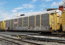 ETTX 906880 is seen on Q261-09 at Cumberland MD on 8/10/12. Rack number is CR 6277, rebuilt and repainted yellow 3-98 and is now owned by NS.
