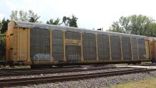 ETTX 907493 is seen in the consist of CSX Q226-03 at Point of Rocks, MD on 9/5/15. Rack number is CR 7053, built 3-89, rebuilt 1-98 and is now owned by NS. Note the rack has black lettering.
