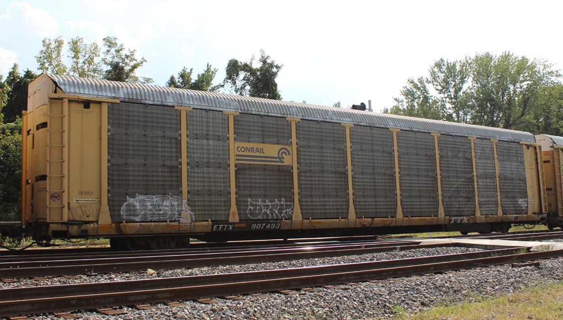ETTX 907493 is seen in the consist of CSX Q226-03 at Point of Rocks, MD on 9/5/15. Rack number is CR 7053, built 3-89, rebuilt 1-98 and is now owned by NS. Note the rack has black lettering.