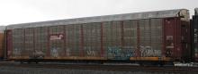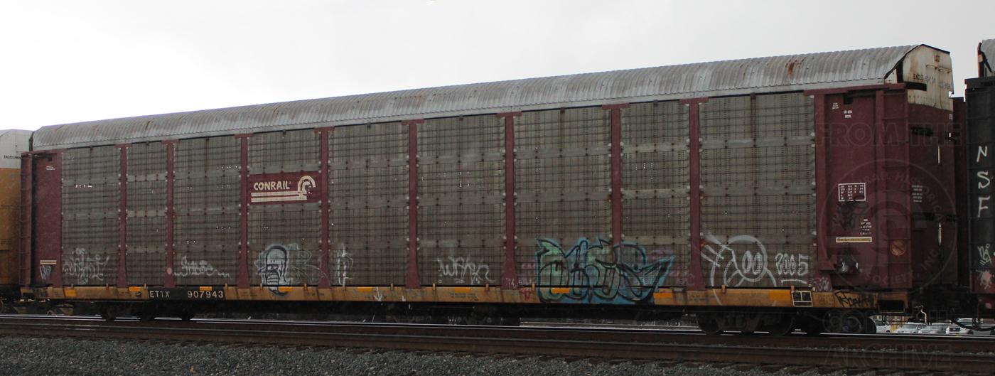 Flatcar ETTX 907943 is seen here with CR class ML3K rack #6116. Rack was built 6-88, rebuilt 12-97 and is now owned by NS.